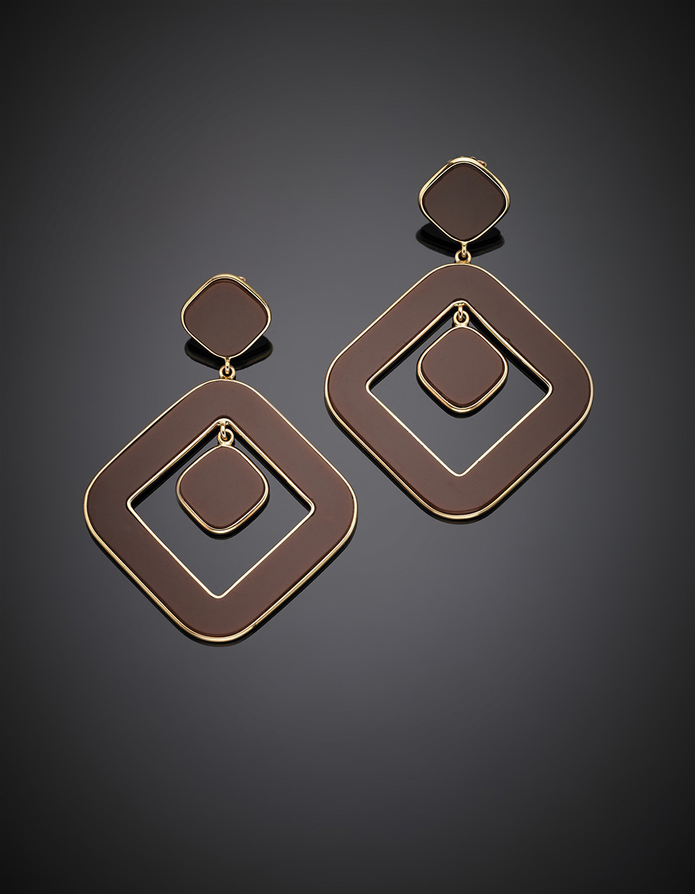 Orecchini in oro giallo e bachelite terra di Siena bruciata, g 18,36, lungh. cm 7,80 circa.