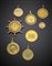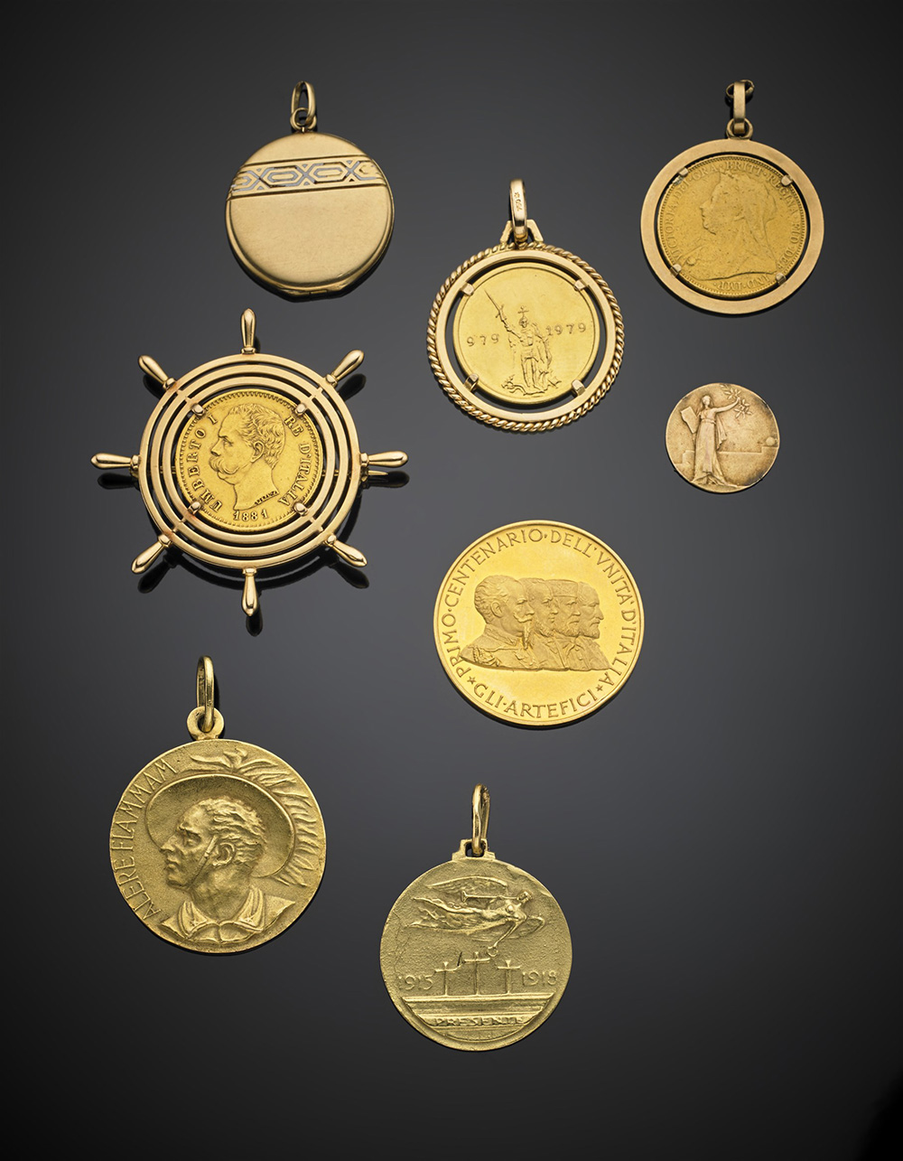 Yellow gold lot comprising five coin charms, a helm brooch with coin, a locket and a pink gold medal, in all g 87.44.