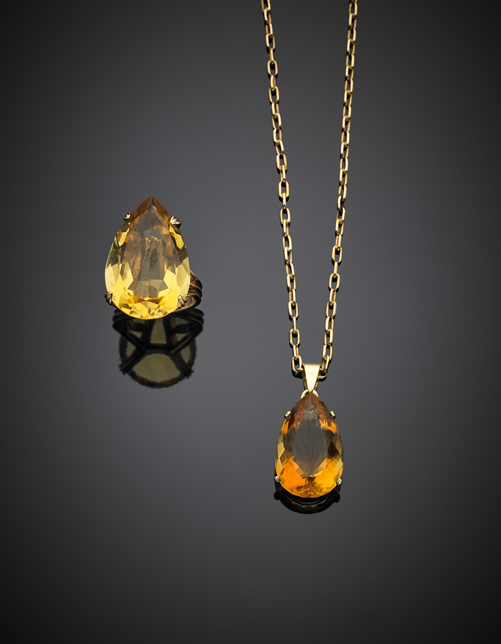 Demi-parure in oro giallo composta da anello e catena con pendente, a rifinire quarzi citrini a goccia, complessivi g 24,80.