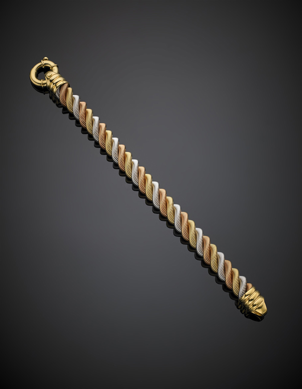 Bracciale a torchon con lavorazione a molla nei tre colori dell'oro con chiusura a moschettone, diam. mm 11,50 circa, g 83,07, lungh. cm 22,80 circa. In scatola velluto blu