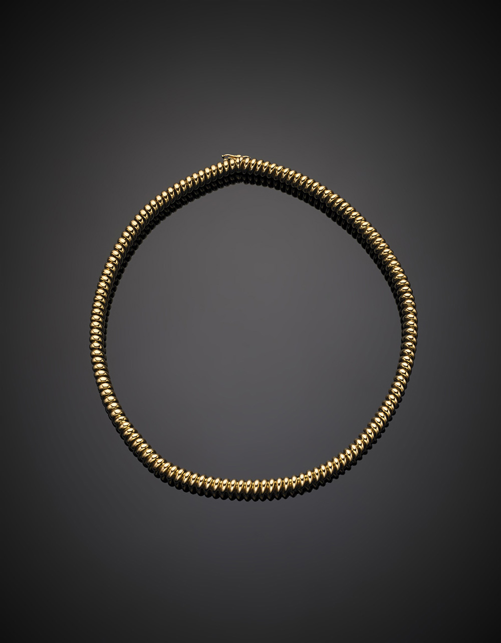 Collier tipo "Bulgari" a tubogas in oro giallo, g 74,61, lungh. cm 45,50 circa.