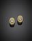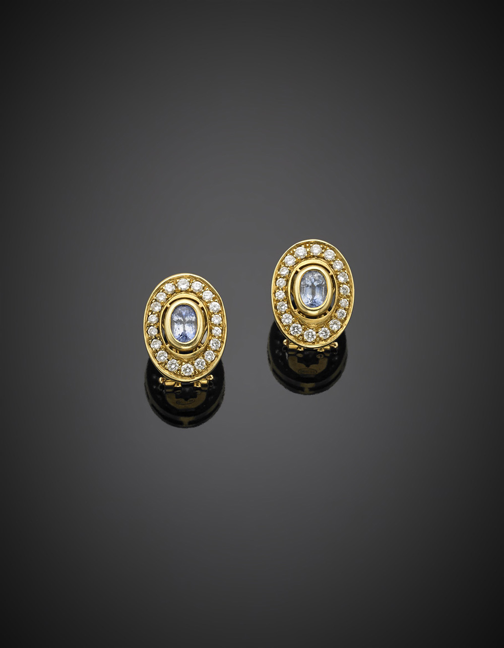 Orecchini a lobo in oro giallo con diamanti rotondi a contornare due zaffiri chiari ovali, g 8,43.