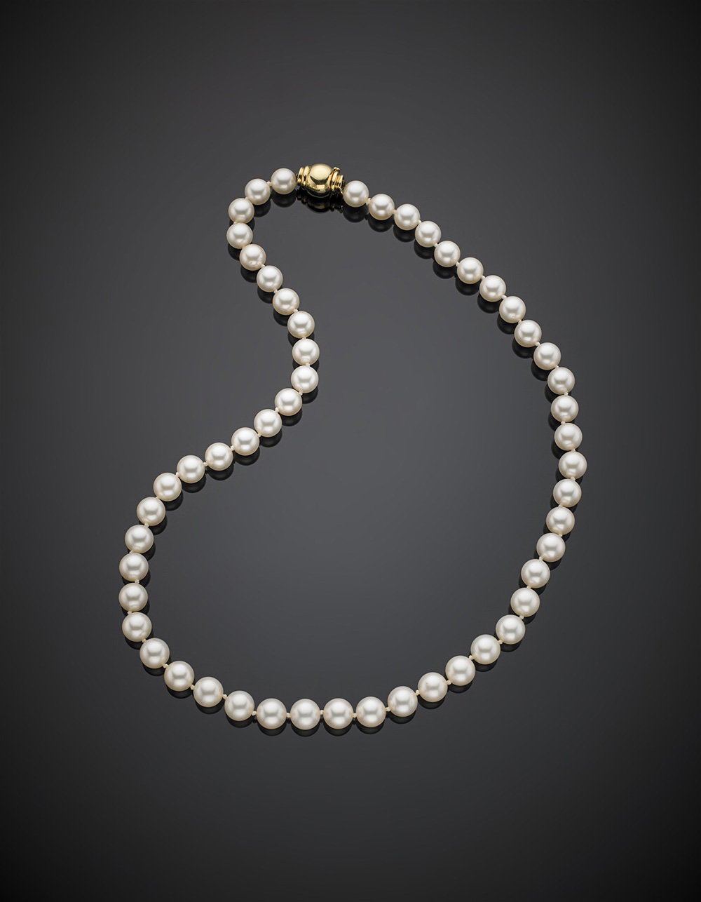 Collana di perle bianche coltivate akoya da mm 7,5 a mm 8, con chiusura in oro giallo, g 40,67, lungh. cm 48,50 circa. In scatola originale di Chiaravalli
