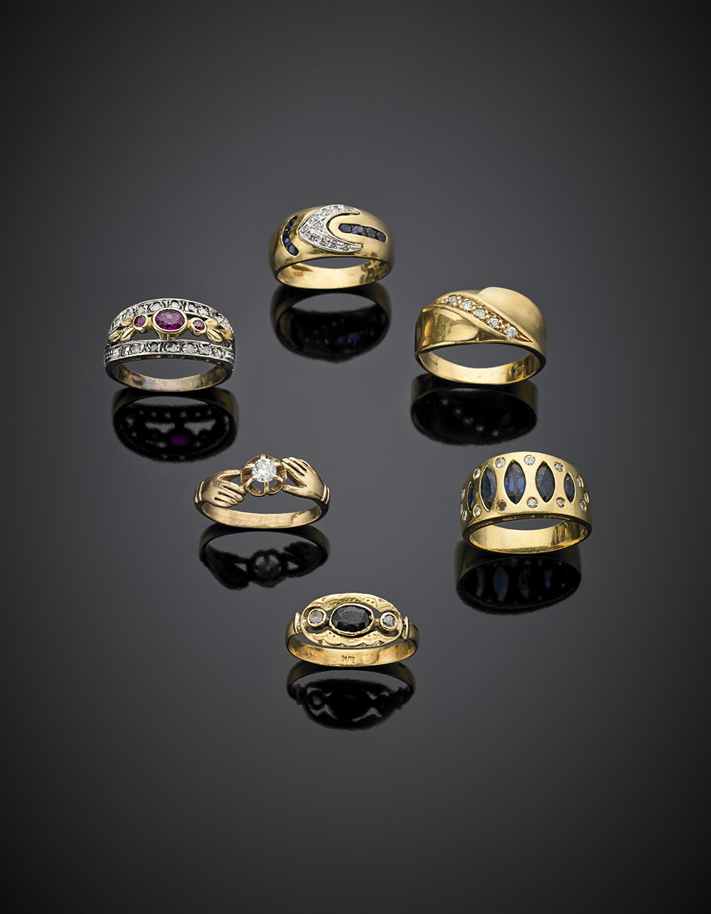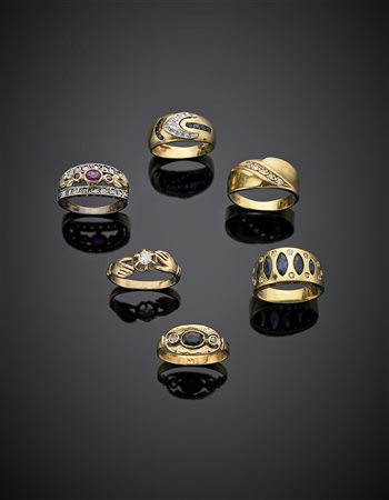 Lotto di sei anelli in oro bianco e giallo, diamanti, zaffiri, rubini e...