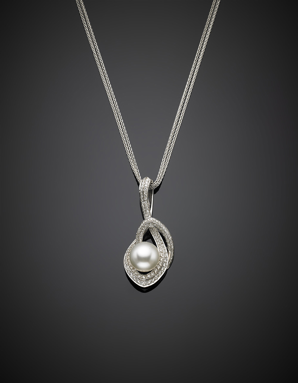 Doppia catena con pendente in oro bianco rifinita con diamanti ed al centro una perla di mm 11/11,5 circa, lievemente a bottone, g 21,02, lungh. cm 48 circa. In scatola e confezione di Damiani