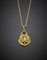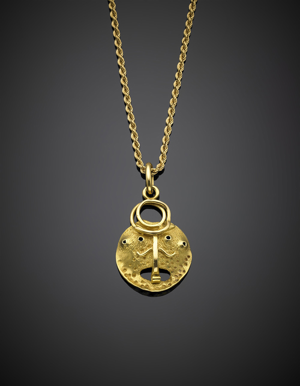 Pendente in oro giallo fuso e battuto a guisa di maschera con catena a torciglione, lungh. catena cm 70 circa, g 37,47, diam. cm 3.