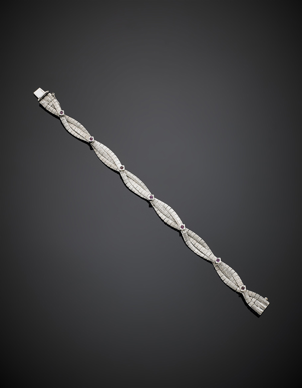 Bracciale in oro bianco satinato e intrecciato rifinito con rubini, g 22,69, lungh. cm 19 circa. In scatola di Vincenti Firenze