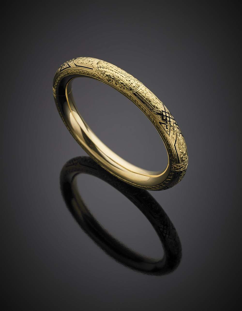 Yellow chiselled gold cuff bracelet accented with black enamel, g 41.25, diam. cm 6.70. (slight defects)