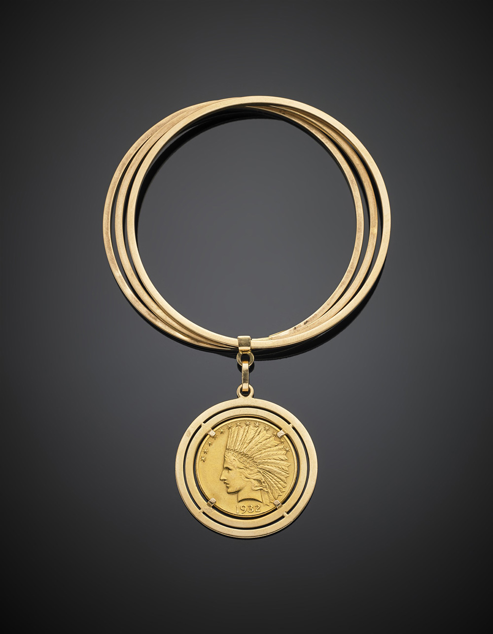 Bracciale ad anelli in oro rosa con moneta da dieci dollari americani in oro giallo, g 44,17, diam. cm 6,70.