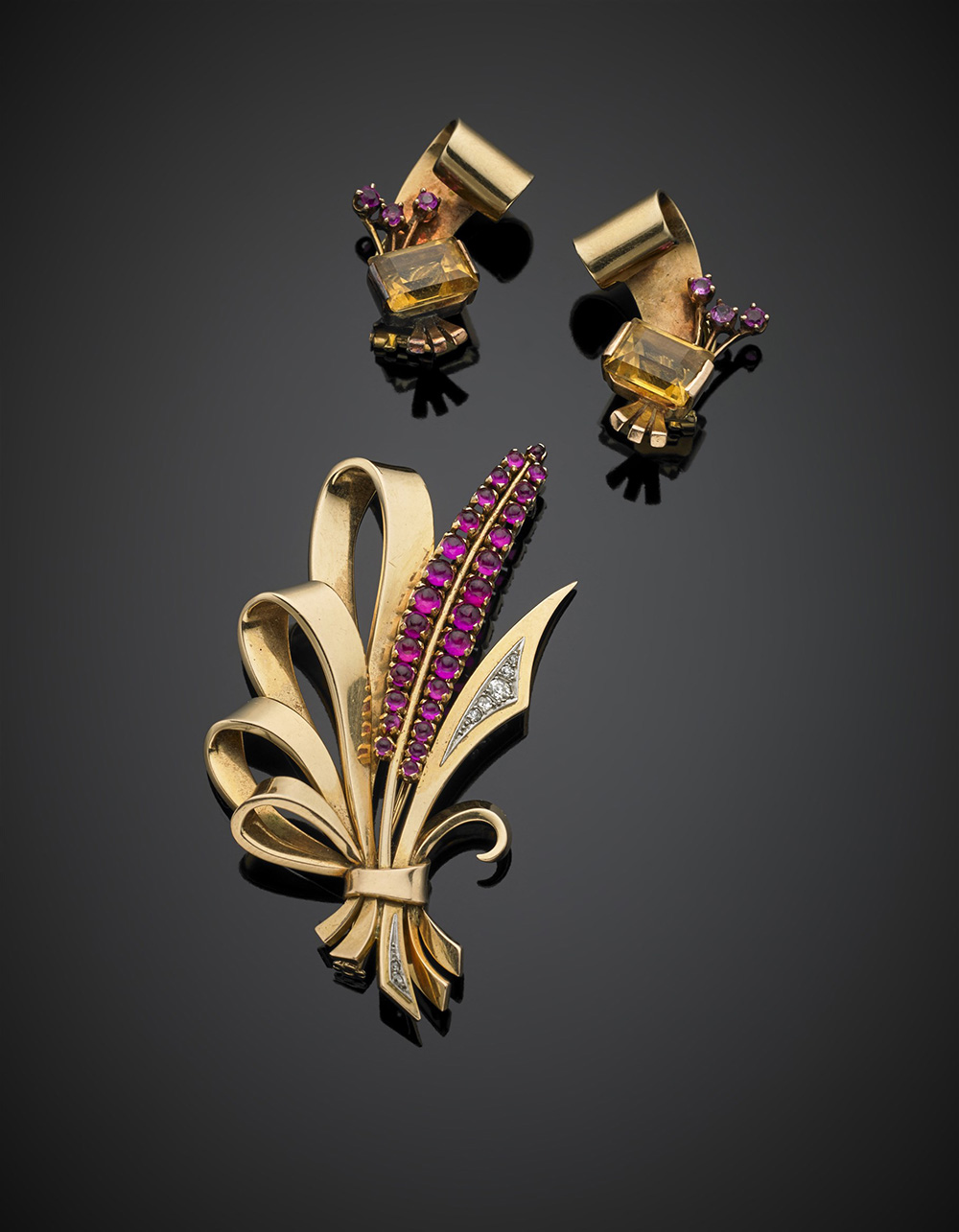 Demi-parure in oro giallo 585/1000 rubini e quarzi citrini composta da spilla a spiga e orecchini a cartiglio, complessivi g 30,33.