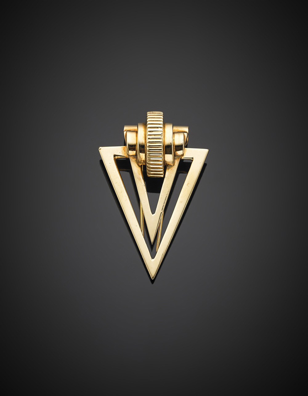 Broche geometrica in oro giallo 585/1000, g 24,40, lungh. cm 5,70 circa.