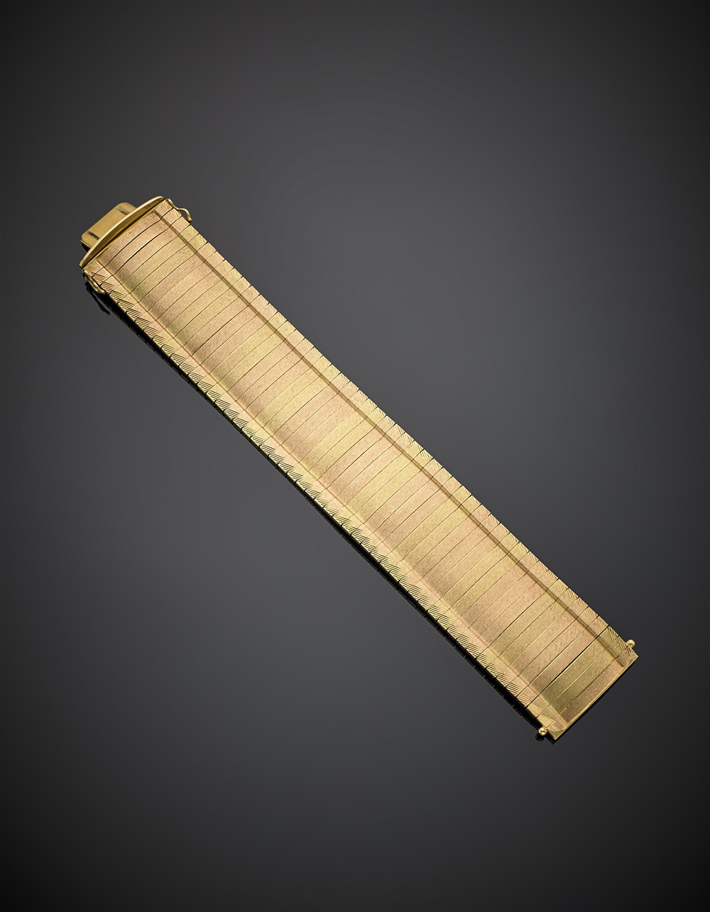 Bracciale modulare a fascia in oro giallo e rosso satinato, g 71,38, lungh. cm 19,20, h cm 3,30 circa.