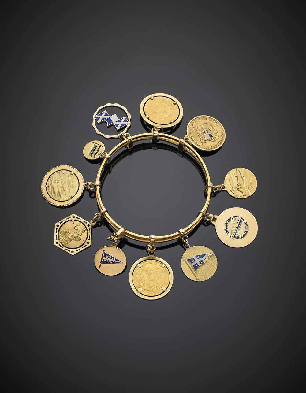 Bracciale rigido in oro con medaglie in parte smaltate relative a manifestazioni motonautiche, g 99,54, diam. cm 6,60. (lievi difetti)