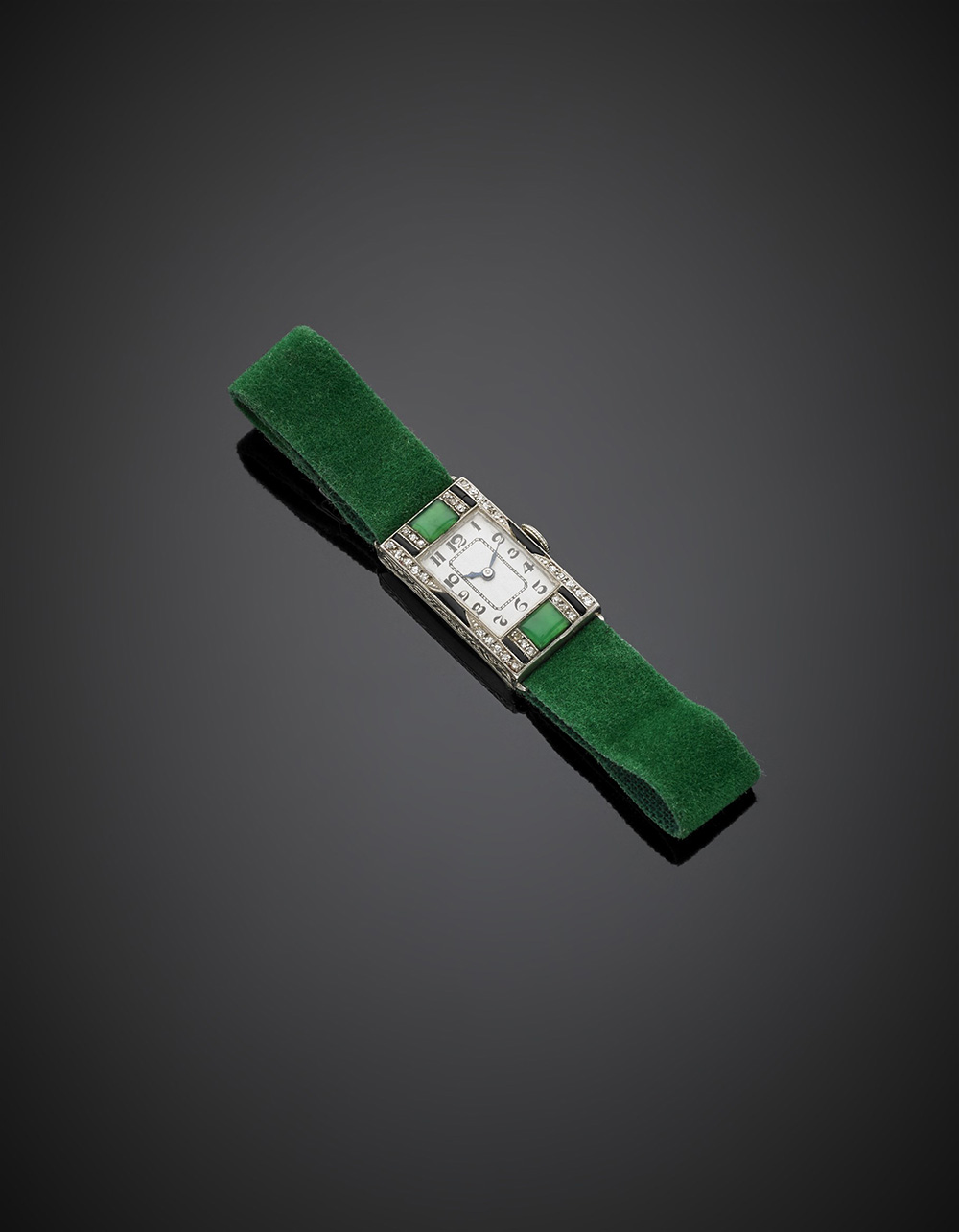 Orologio in platino con diamanti, onice e bracciale in tessuto adattabile, g 14,30, lungh. cm 17 circa. In scatola originale