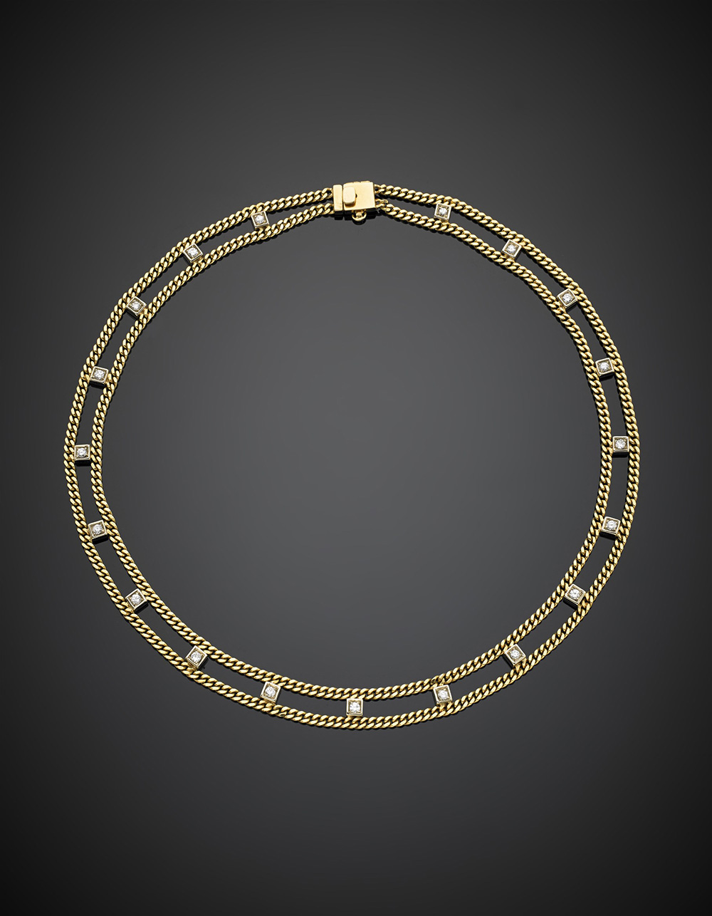 Collier in oro giallo a due giri festonati di catena groumette distanziati da diciannove diamanti montati in oro bianco, g 34,07, lungh. cm 38,50 circa.