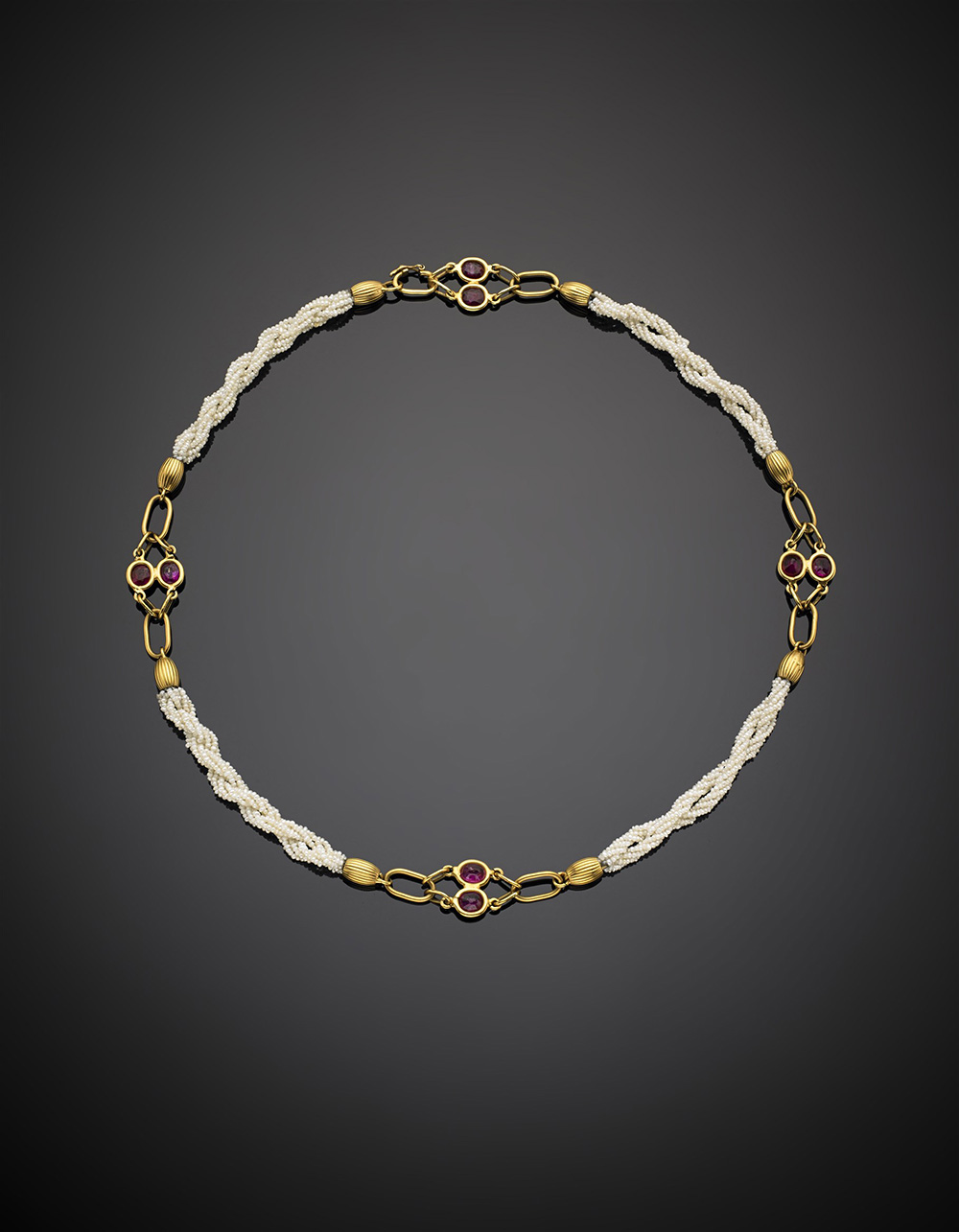 *Collana in oro giallo, torchon di micro perle e rubini, g 17,75, lungh. cm 44 circa.