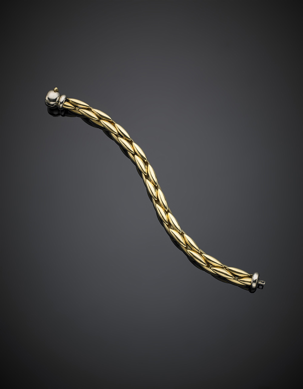 Bracciale intrecciato in oro giallo con chiusura in oro bianco a scomparsa, g 51,58, lungh. cm 21,40 circa.