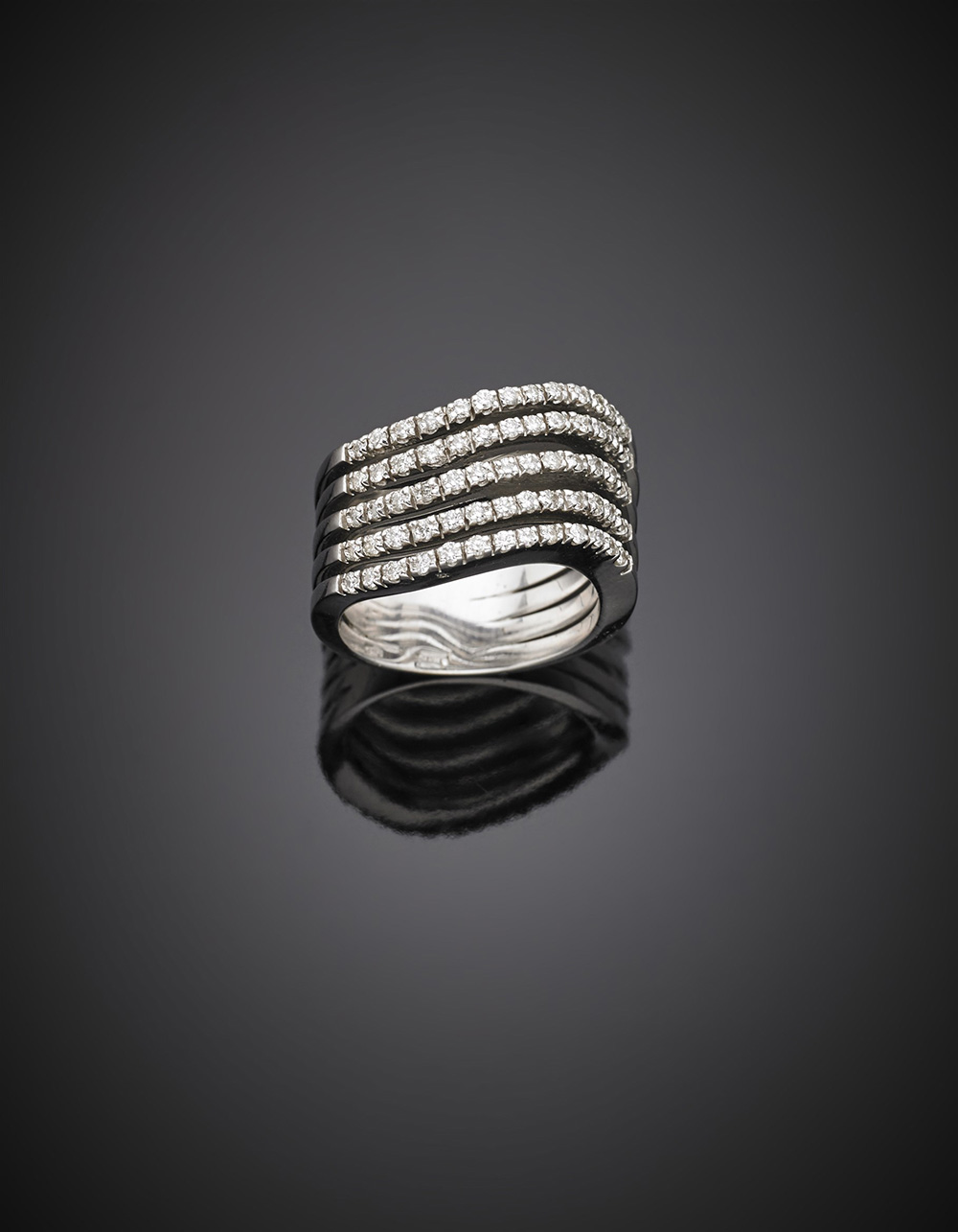 Anello a fascia in oro bianco a più file ondulate di diamanti rotondi, g 16,20 misura 14/54.