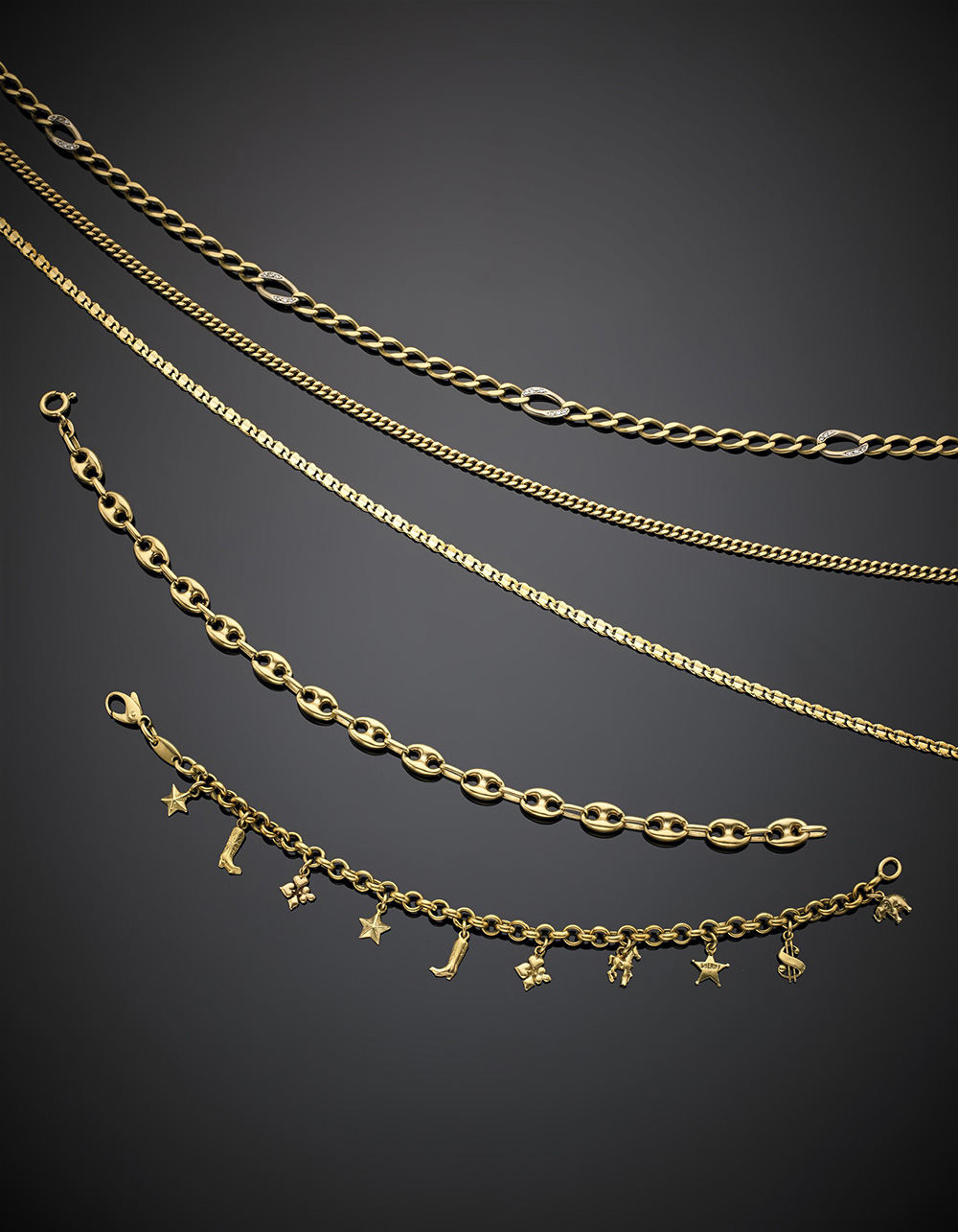 Lotto di tre collane e due bracciali, di cui due catenine con piccoli diamanti, i due bracciali in oro giallo, di cui uno con charms, complessivi g 89,54.