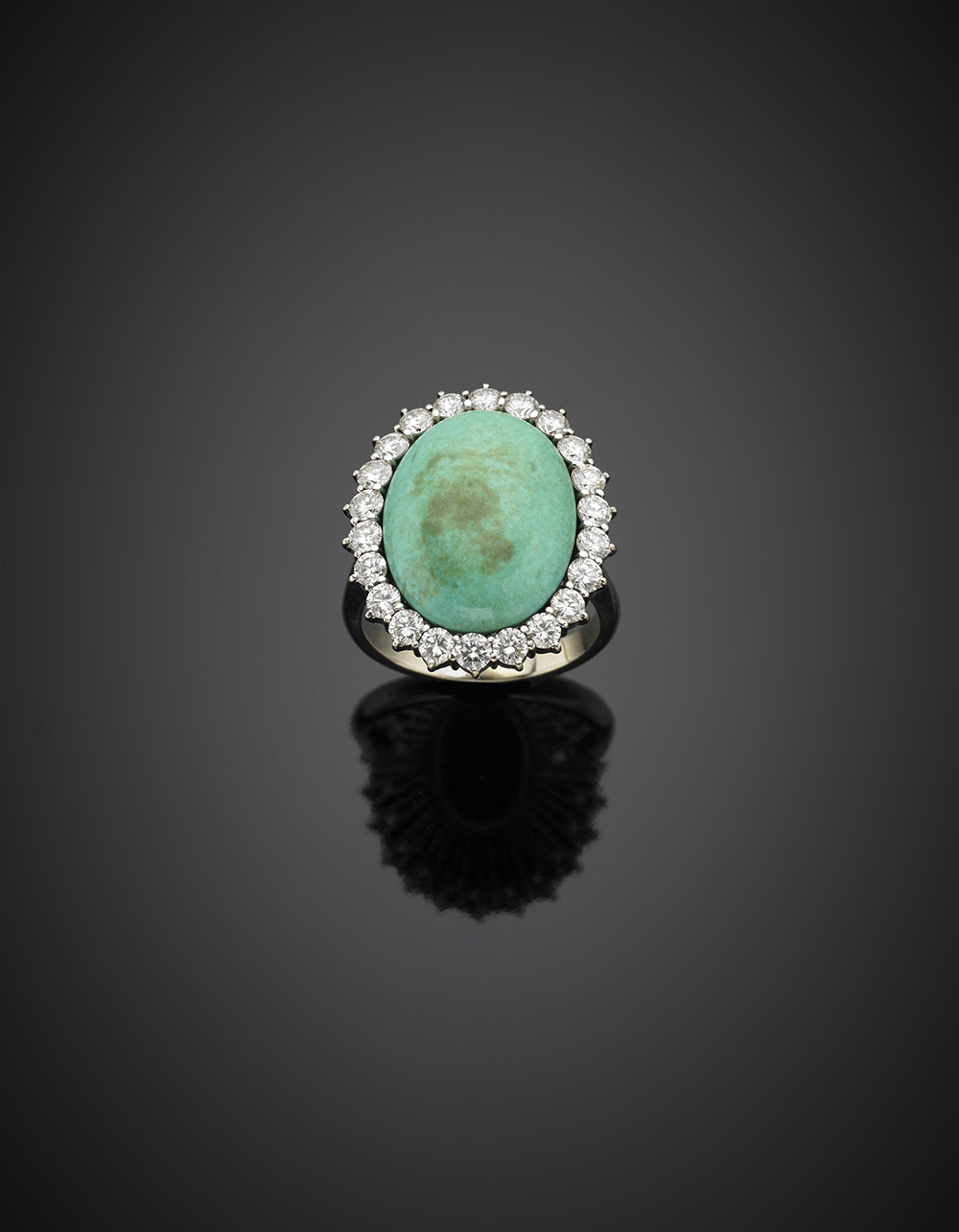 Anello con turchese ovale cabochon e diamanti intorno, g 11,09 misura 17/57.