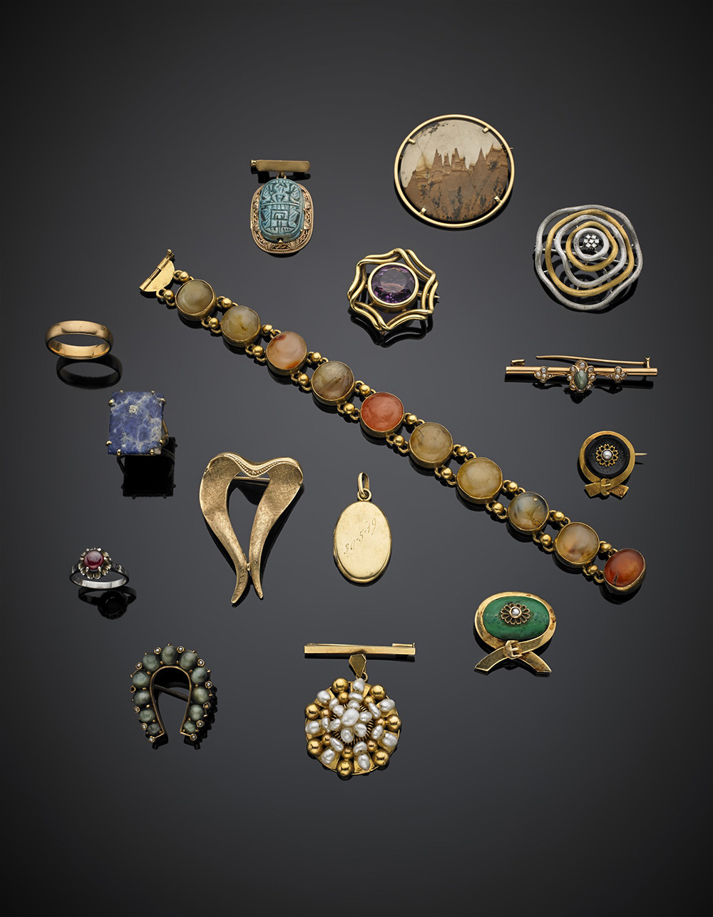 Yellow gold, hard stone and pearl lot comprising various jewels, in all g 148.79.