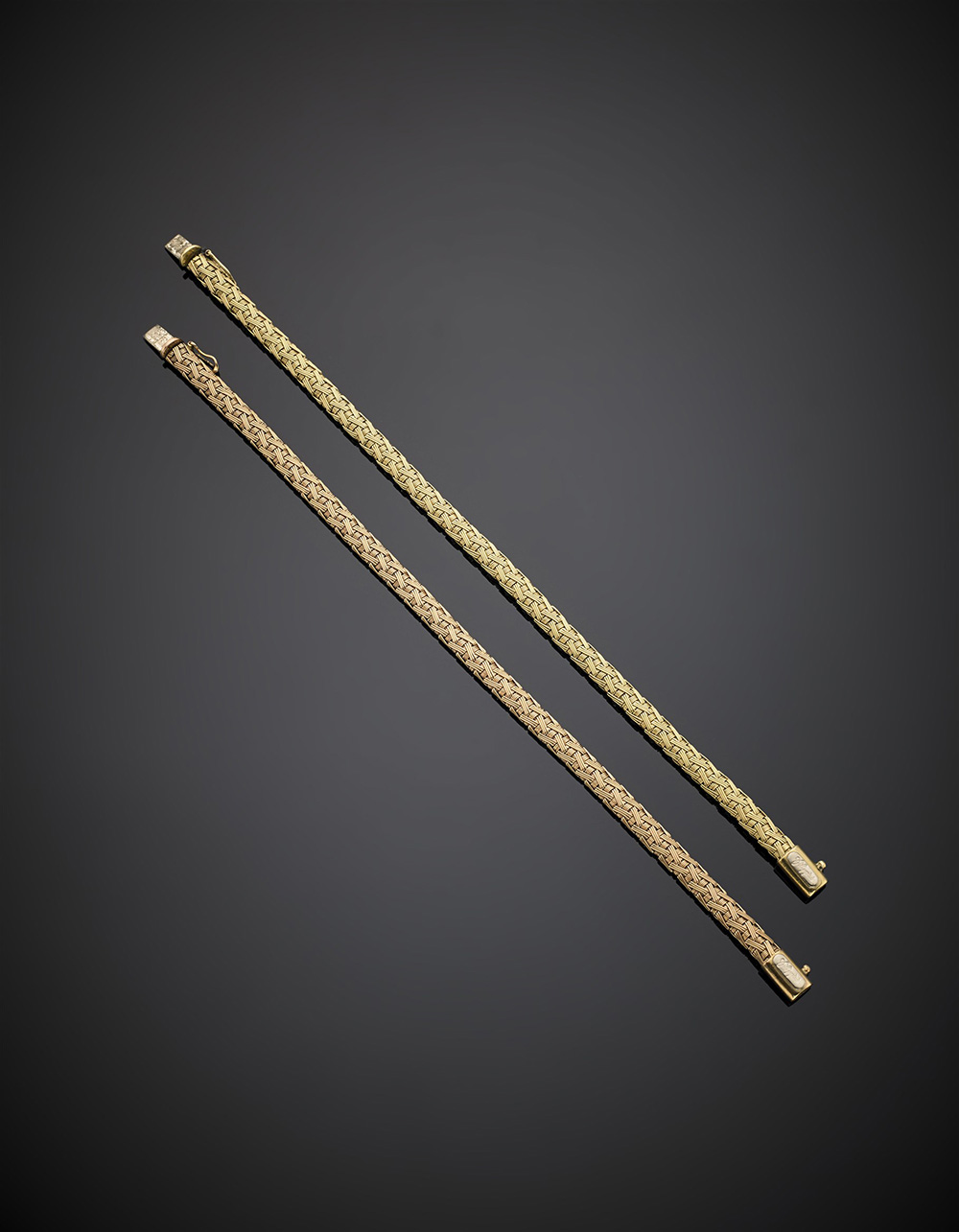 Due bracciali in oro giallo e rosso con lavorazione ad intreccio, congiungibili a formare un collier, complessivi g 38,53, lungh. cm 19,20 circa.