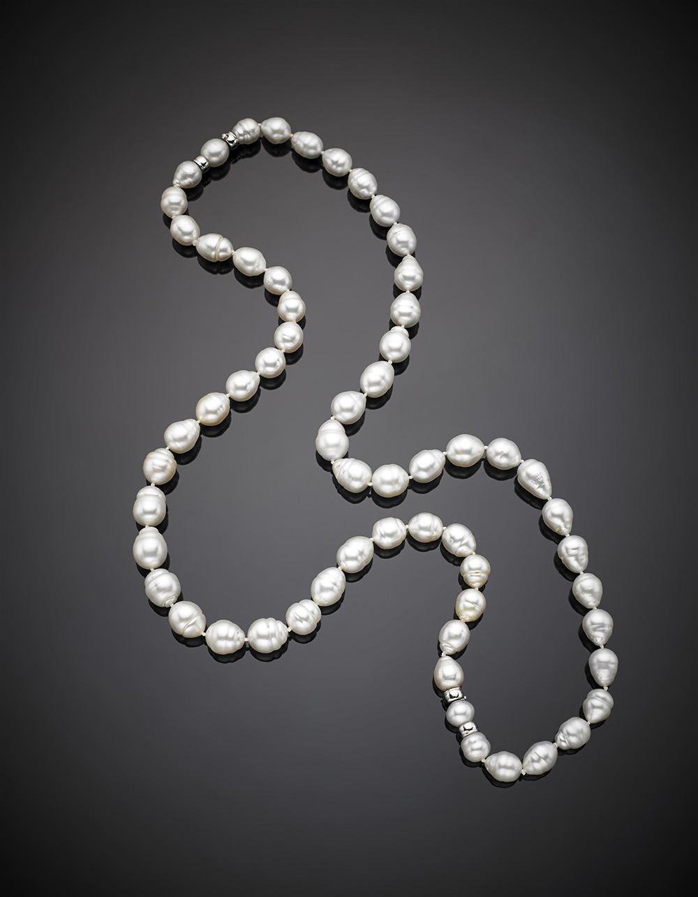 Collana di perle South-sea irregolari e scalate di color bianco/grigio composto da due collane separabili, chiusure in oro bianco, complessivi g 125,43, lungh. cm 85 circa.