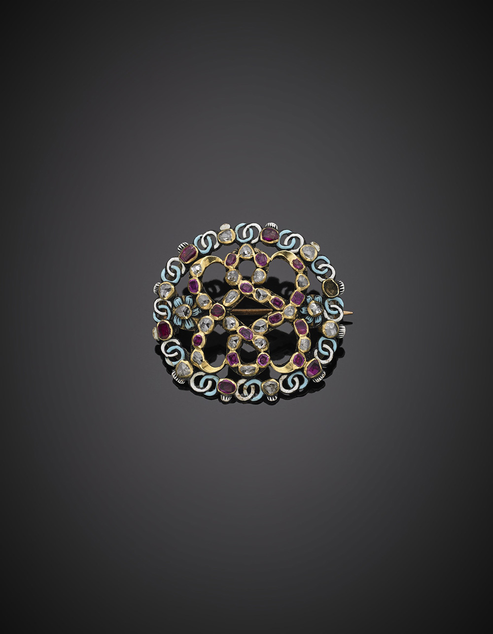 Yellow gold and silver small ruby, rose cut diamonds and enamel round brooch, g 7.46, length cm 3.10, width cm 2.90 circa. (losses)