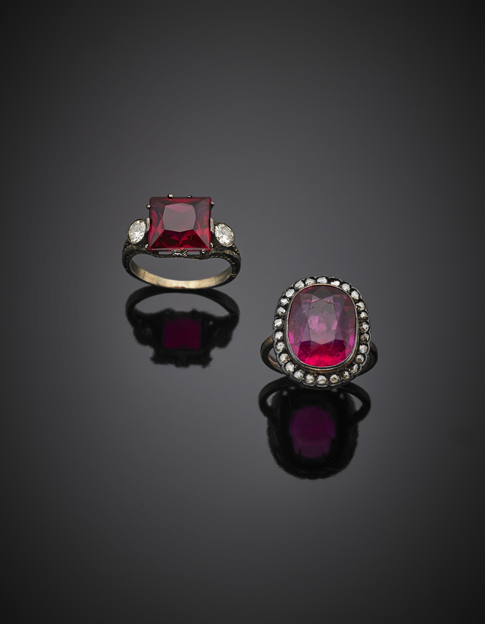 Two synthetic ruby, round and rose cut diamond, gold and silver rings, in all g 10.99 size 12/52