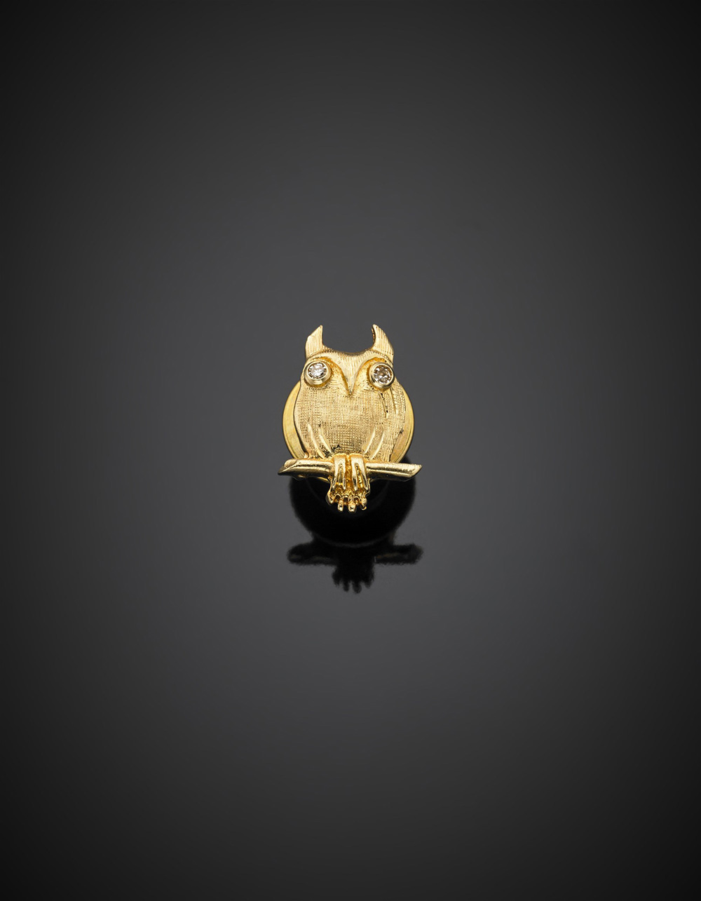 Pin in oro giallo satinato a guisa di gufetto con piccoli diamanti, g 3,49.