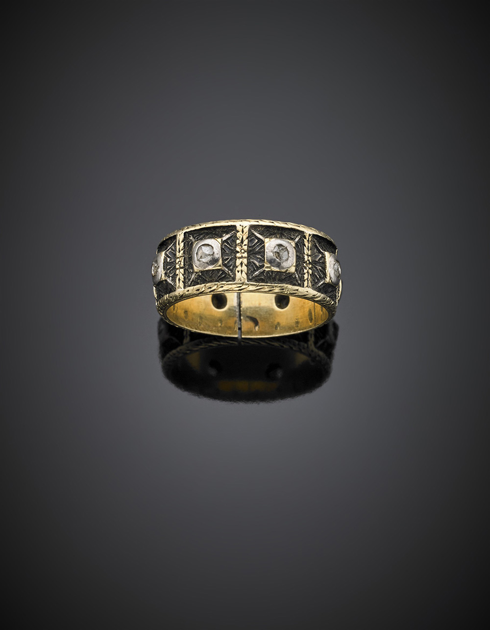 Anello a fascia come una fede in oro e argento, diamanti mezza rosetta (tagliato), g 11,28 misura 26/66.
