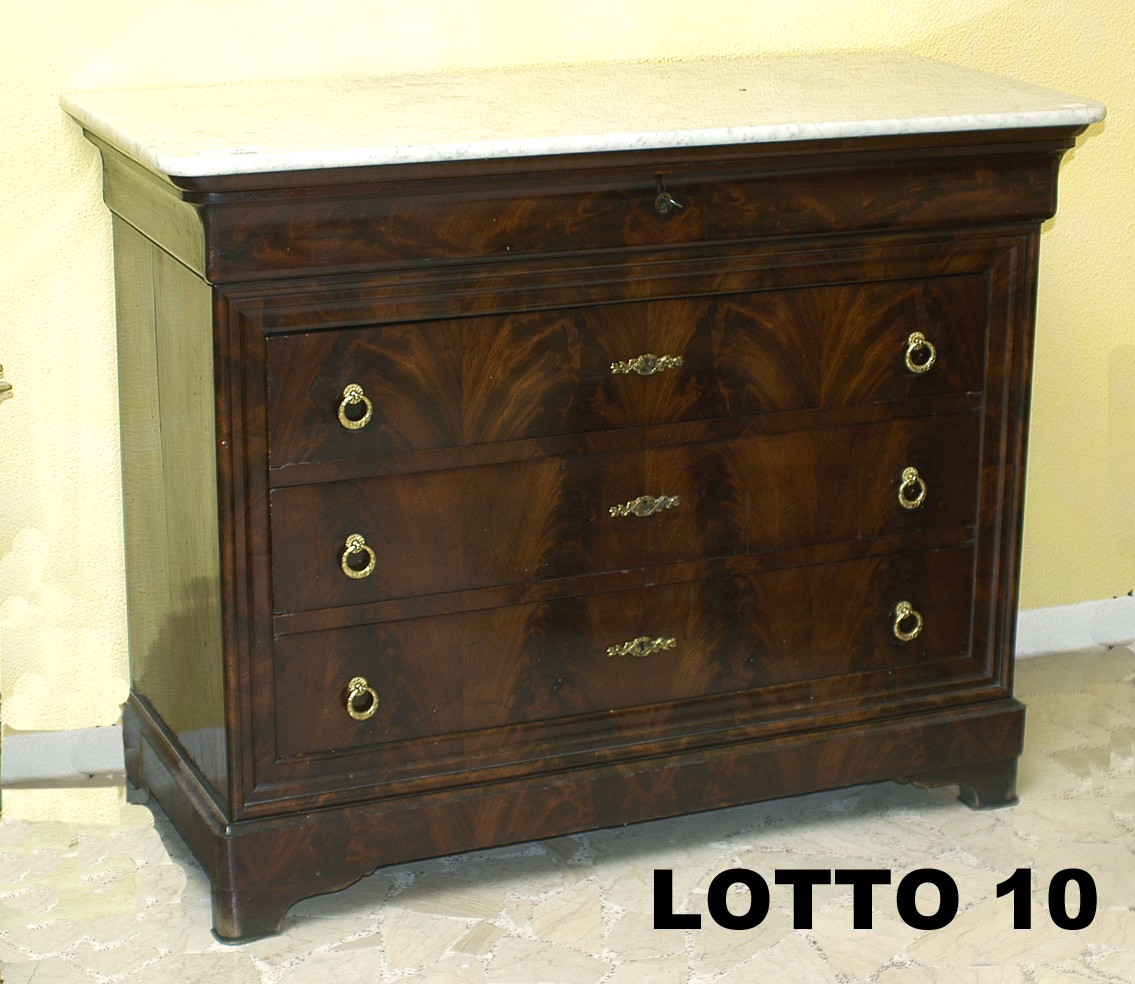 COMO' A 3 CASSETTI E MEZZO IN PIUMA DI MOGANO E PIANO IN MARMO BIANCO PARIGI EPOCA LUIGI FILIPPO META' DEL XIX° SEC. (RESTAURATO)