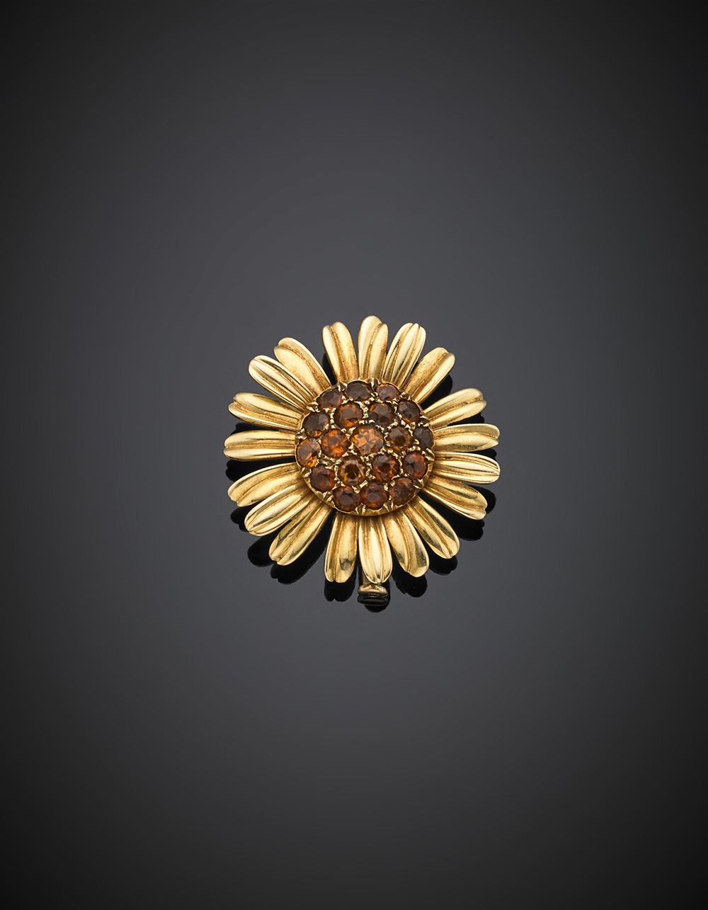 Spilla a guisa di girasole in oro giallo, rifinita con quarzi madeira, g 10,60.