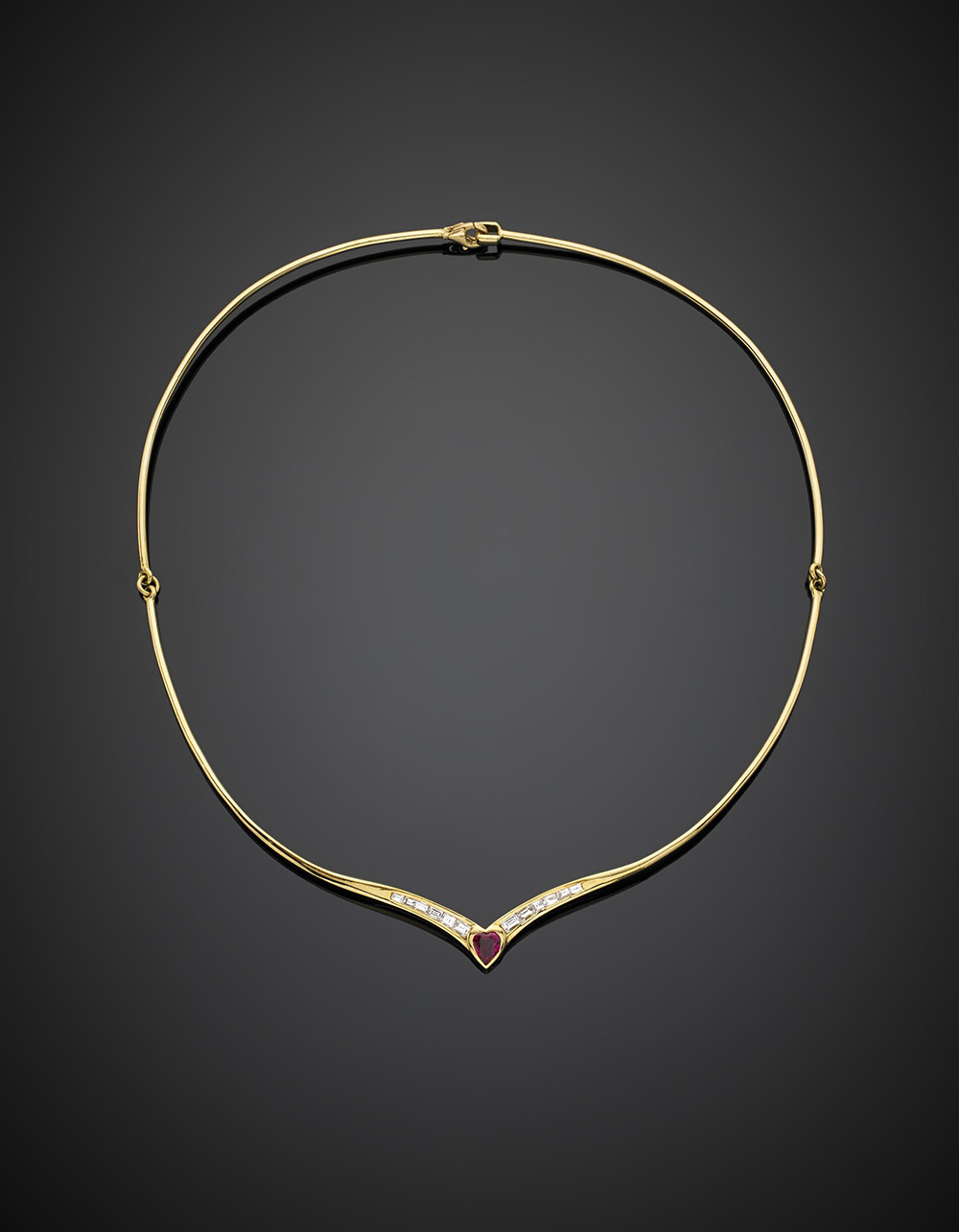 Yellow gold collar choker centered by a heart ruby and tapered diamonds, g 17.18, diam. cm 12. In original custody