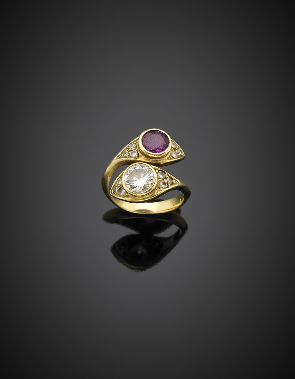 Anello contrarie in oro giallo con diamanti a contornare un rubino rotondo di ct. 1,37 circa ed un diamante sempre rotondo di ct. 1,30 circa, g 8,39 misura 14/54.