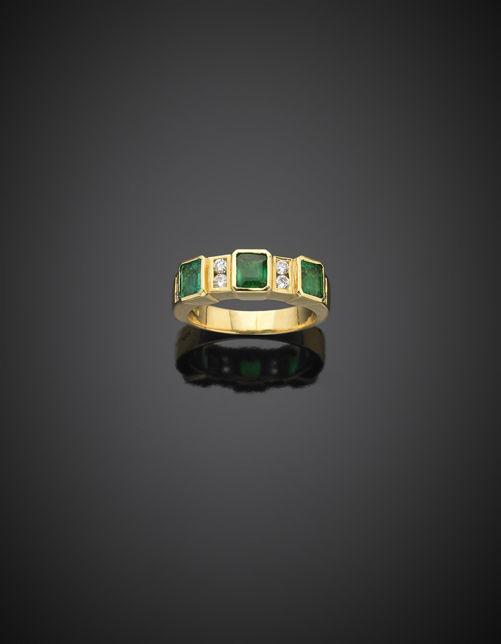 Anello in oro giallo con tre smeraldi rettangolari per complessivi ct. 1,22 circa alternati a diamanti, g 8,31 misura 16/56. Firmato MISSIAGLIA.