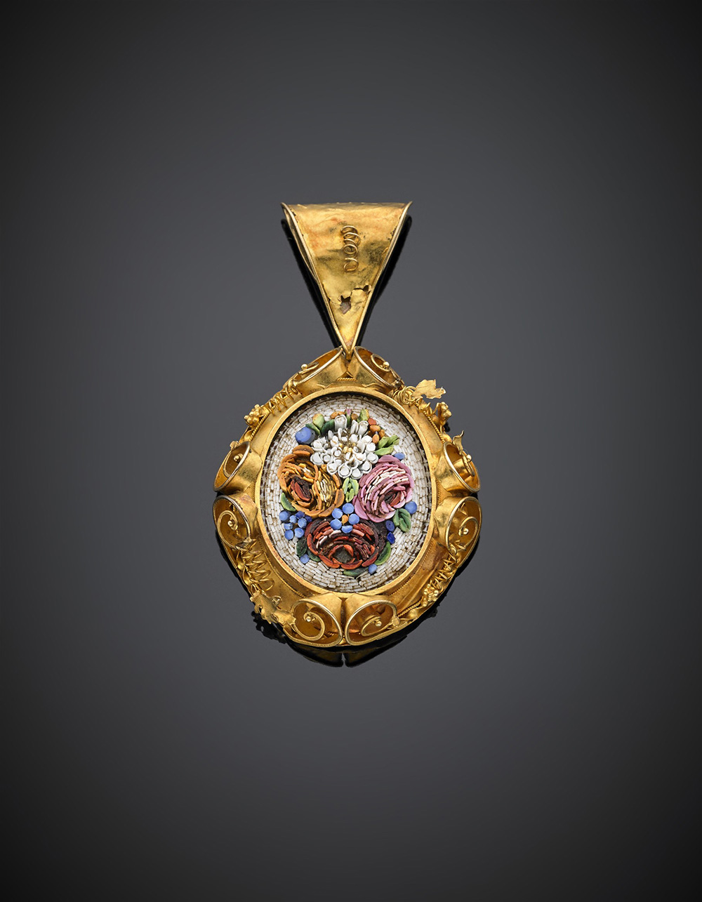 Lotto 785 | Pendente in oro giallo con portafoto e mosaico in rilievo, g 10,03, lungh. cm...