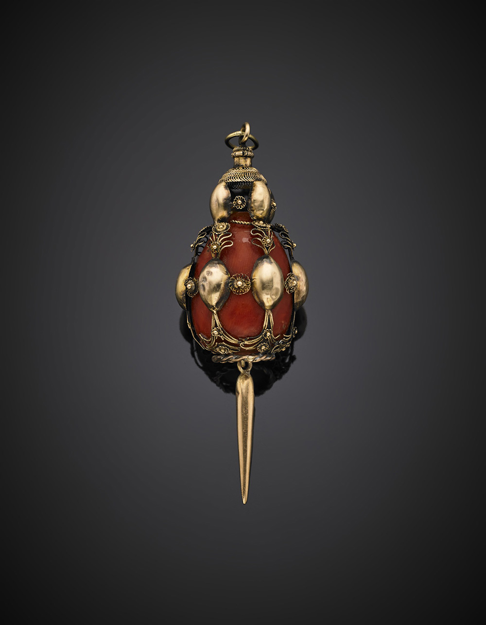 Red coral ovoid pendant with red gold filigree mount, g 12.68, length cm 6.80 circa.