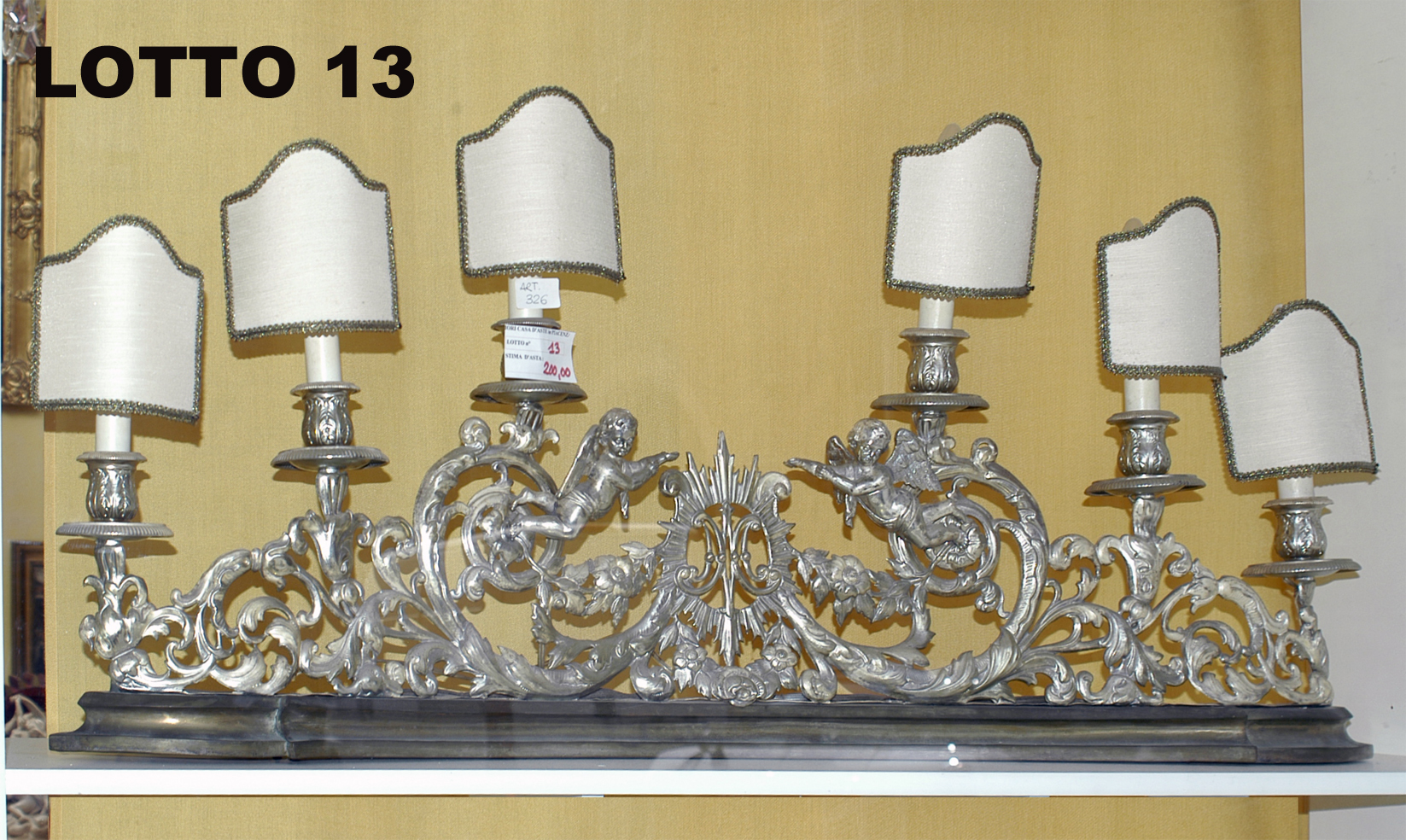 CANDELABRO A 6 LUCI IN METALLO SBALZATO E ARGENTATO SORMONTATO DA DUE PUTTI ITALIA INIZI DEL XIX° SEC.