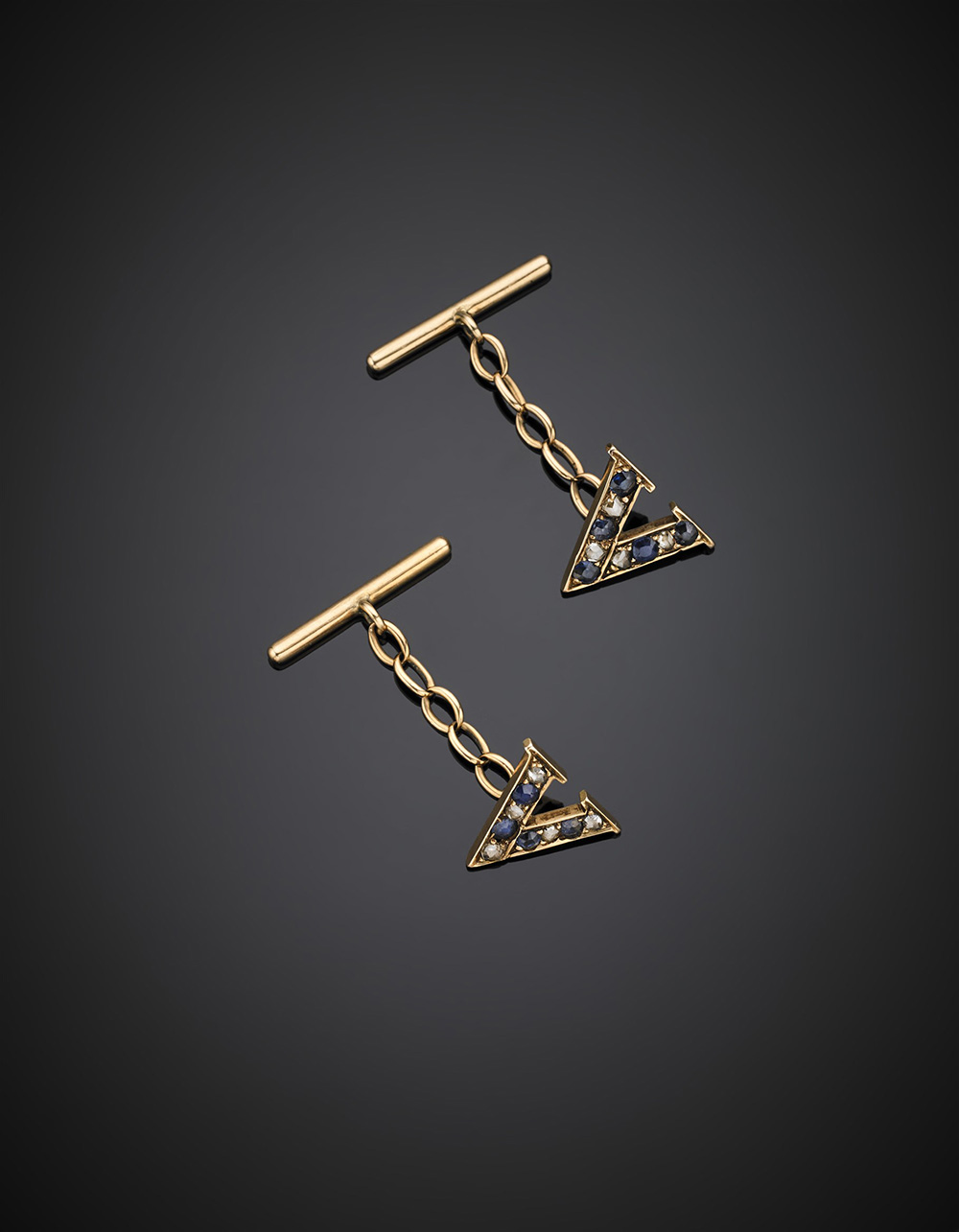 Gemelli con lettera "V" in oro giallo 585/1000 con diamanti a mezza rosetta e zaffiri rotondi, g 6,71.
