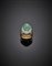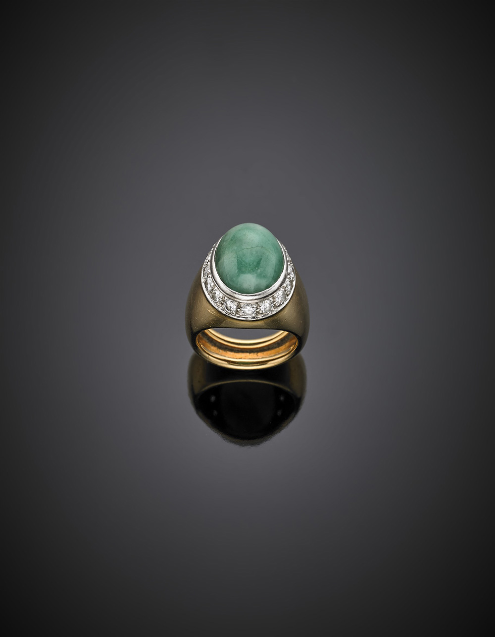 Anello in oro giallo e bianco, con diamanti a contornare uno smeraldo ovale cabochon, g 10,30 misura 5/45.