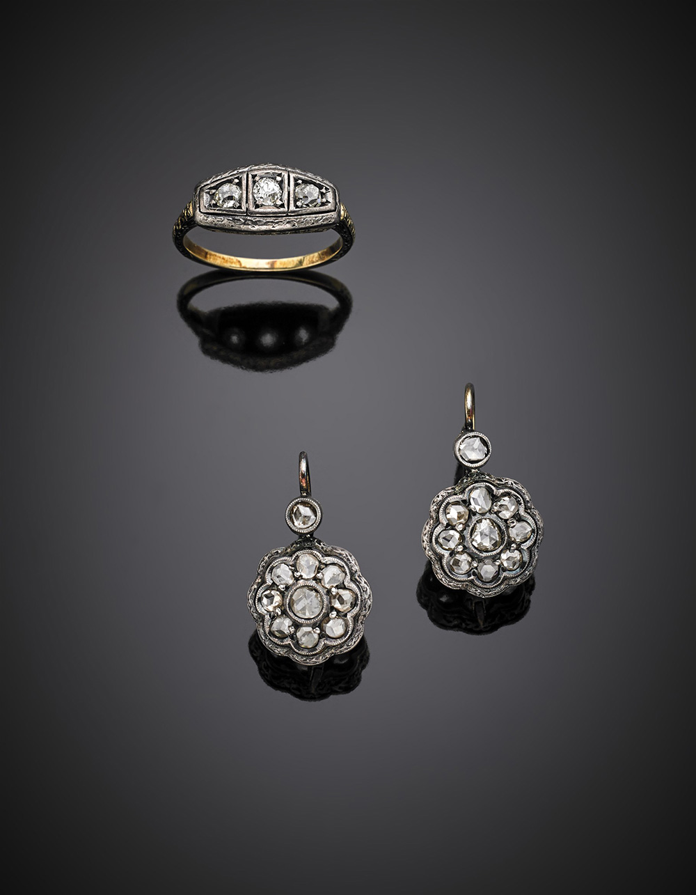 Demi-parure composta da orecchini e anello in oro giallo, argento con diamanti a mezza rosetta , g 11,27 misura 17/57.