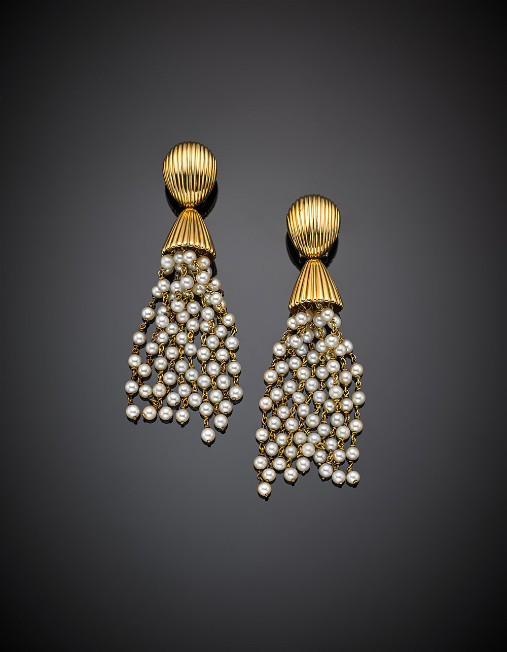 Orecchini pendenti in oro giallo con nappe in perle, g 36,24, lungh. cm 9 circa.