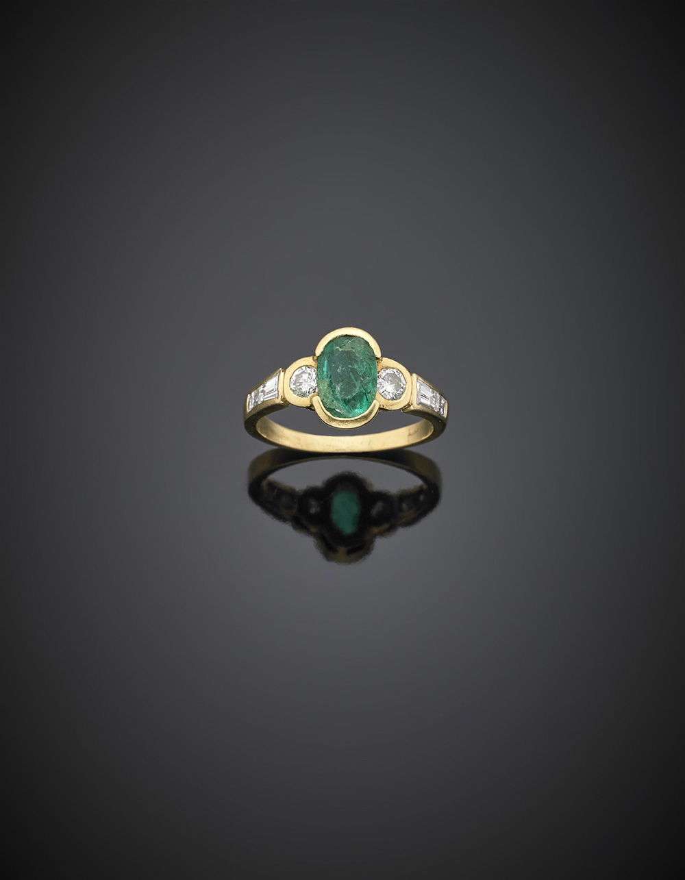 Anello in oro giallo con smeraldo ovale, diamanti rotondi e tapered, g 3,19 misura 12,5/52,5.