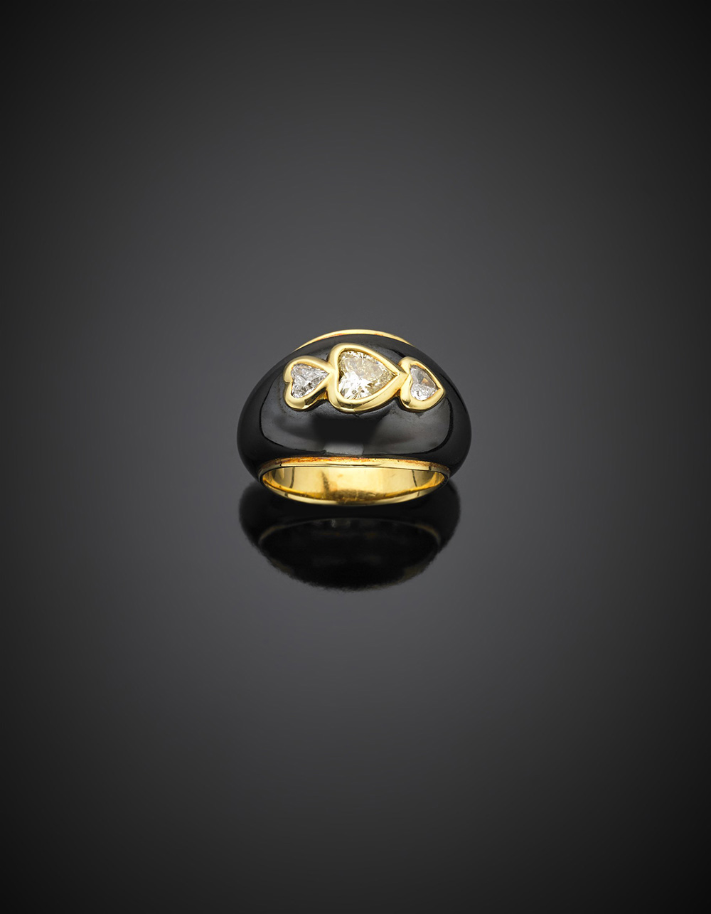 *Anello bombato in oro giallo ed ematite con tre diamanti a cuore, il...