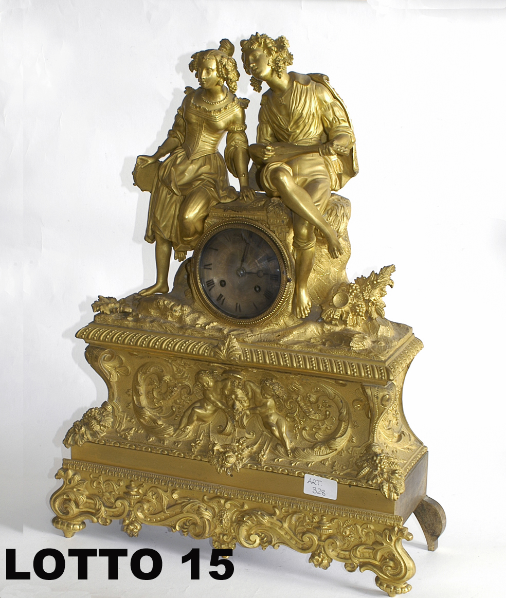 PENDOLA IN BRONZO DORATO SORMONTATA DA SCULTURE RAFF. SUONATORI FRANCIA EPOCA LUIGI FILIPPO META' DEL XIX° SEC.