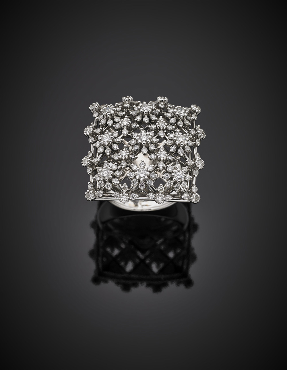 Anello in oro bianco e diamanti a formare un cuscino di fiori, g 15,21 misura 12/52.