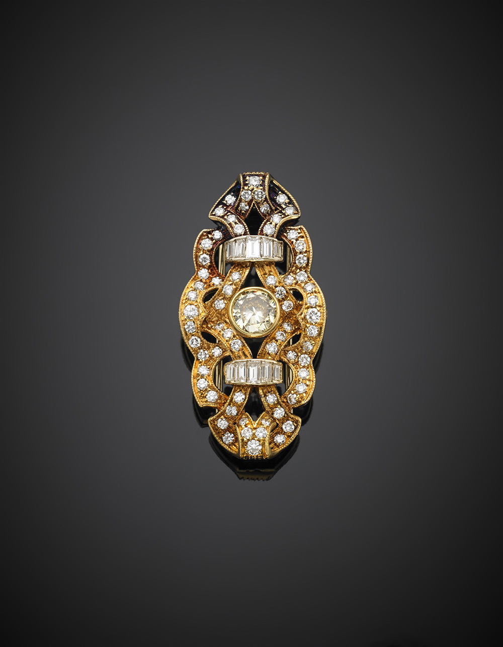 Broche a volute in oro giallo con diamanti rotondi e a baguette, al centro un diamante fancy yellow di ct. 0,90 circa, g 11,43, lungh. cm 4 circa. Firmata MISSIAGLIA. (lievi difetti)