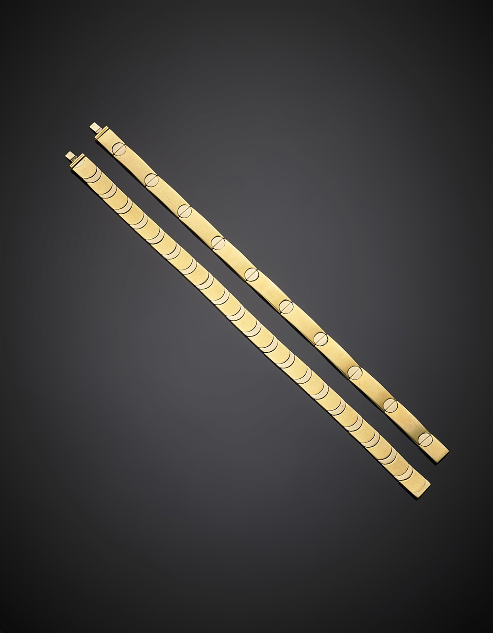 Due bracciali modulari in oro giallo e bianco a cerniere invisibili,...
