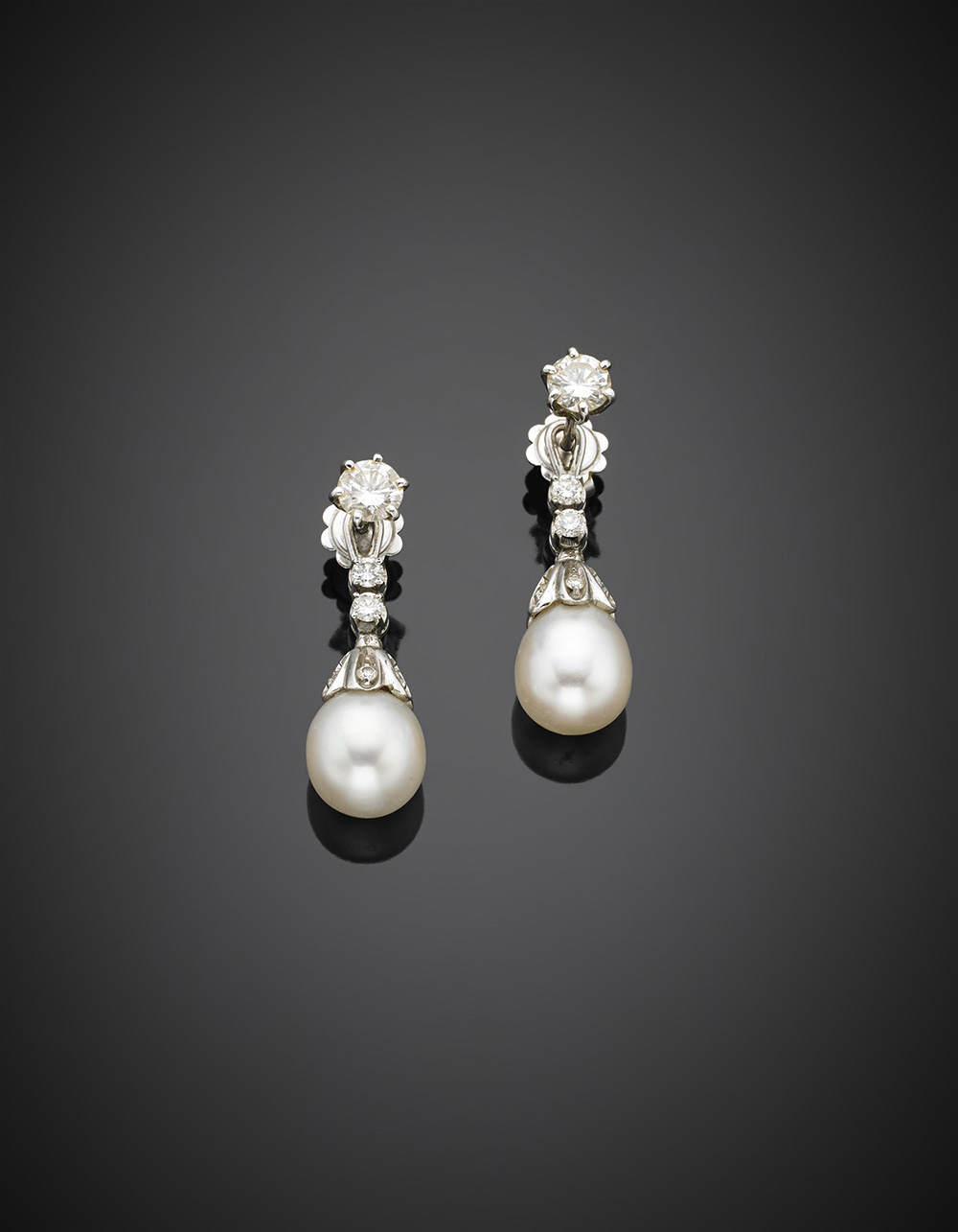 Orecchini pendenti in oro bianco rifiniti con diamanti e terminati da due perle bianche a goccia di mm 9,50 circa, pendente rimovibile, diamanti per complessivi ct. 1,20 circa g 7,95, lungh. cm 2,80 circa.